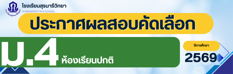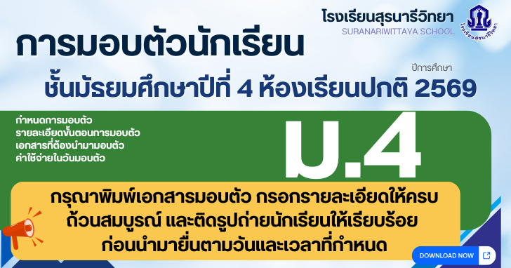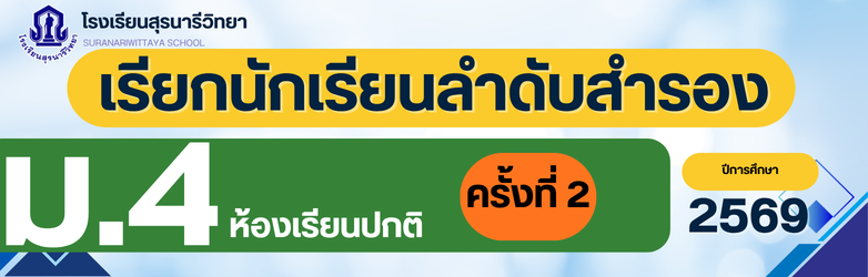 ประกาศโรงเรียนสุรนารีวิทยา เรื่อง เรียกนักเรียนลำดับสำรอง ชั้นมัธยมศึกษาปีที่ 4 ห้องเรียนปกติ ปีการศึกษา 2569 กลุ่มการเรียนศิลป์-ภาษาอังกฤษ มารายงานตัวและมอบตัว(ครั้งที่ 2)