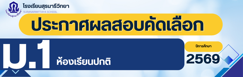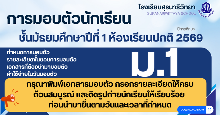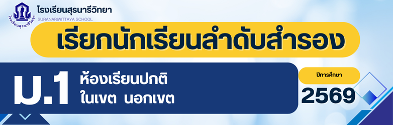 ประกาศโรงเรียนสุรนารีวิทยา เรื่อง เรียกนักเรียนลำดับสำรอง ชั้นมัธยมศึกษาปีที่ 1 ห้องเรียนปกติ ปีการศึกษา 2569 ในเขตพื้นที่บริการ มารายงานตัวและมอบตัว (ครั้งที่ 3)