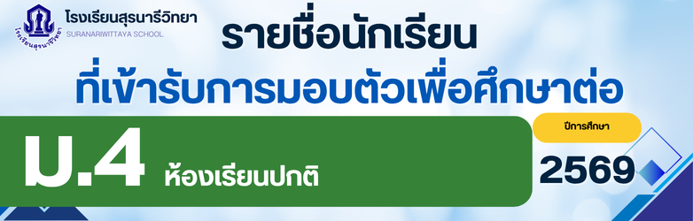 ประกาศโรงเรียนสุรนารีวิทยา เรื่อง เรียกนักเรียนลำดับสำรอง ชั้นมัธยมศึกษาปีที่ 4 ห้องเรียนปกติ ปีการศึกษา 2569 กลุ่มการเรียนศิลป์-ภาษาอังกฤษ มารายงานตัวและมอบตัว(ครั้งที่ 2)