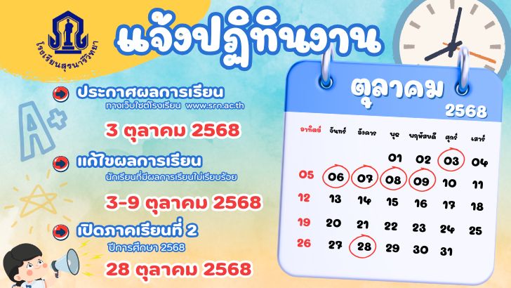 แจ้งปฏิทินท่านผู้ปกครองและนักเรียน ชั้นมัธยมศึกษาปีที่ 1 - 6 ต้องทราบเพื่อดำเนินการ