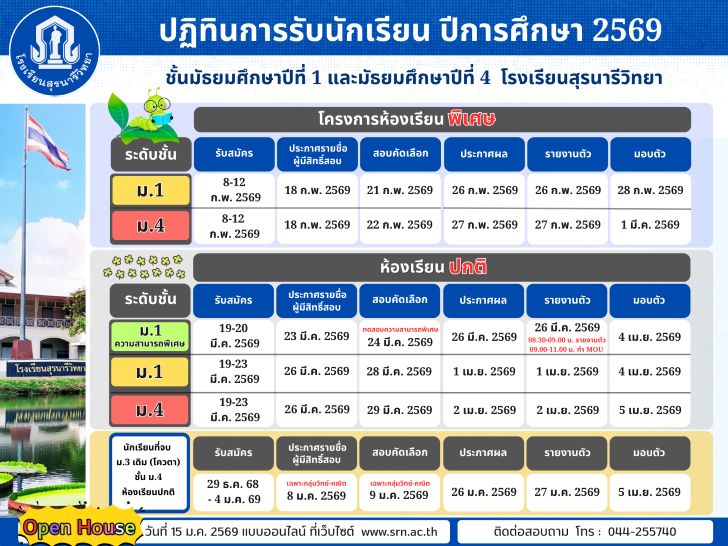 ประกาศโรงเรียนสุรนารีวิทยา ฉบับที่ 4/2569 เรื่อง การรับนักเรียนโครงการห้องเรียนพิเศษ ชั้นมัธยมศึกษาปีที่ 1 และชั้นมัธยมศึกษาปีที่ 4 โรงเรียนสุรนารีวิทยา ปีการศึกษา 2569